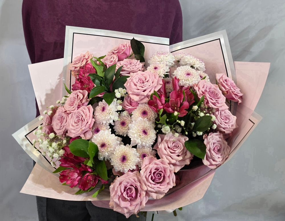 Букет состоит из нежно-розовых кустовых роз, малиновой альстромерии, белой хризантемы и гипсофилы, а также украшен светло-розовой флористической упаковкой.