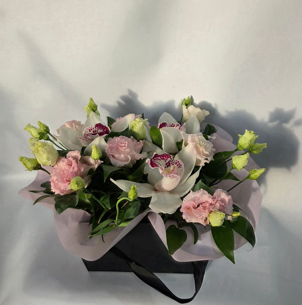 Композиция собрана в чёрную коробку с нежно розовой плёнкой, состоит из белых орхидей, нежно розовой эустомы и зелени.