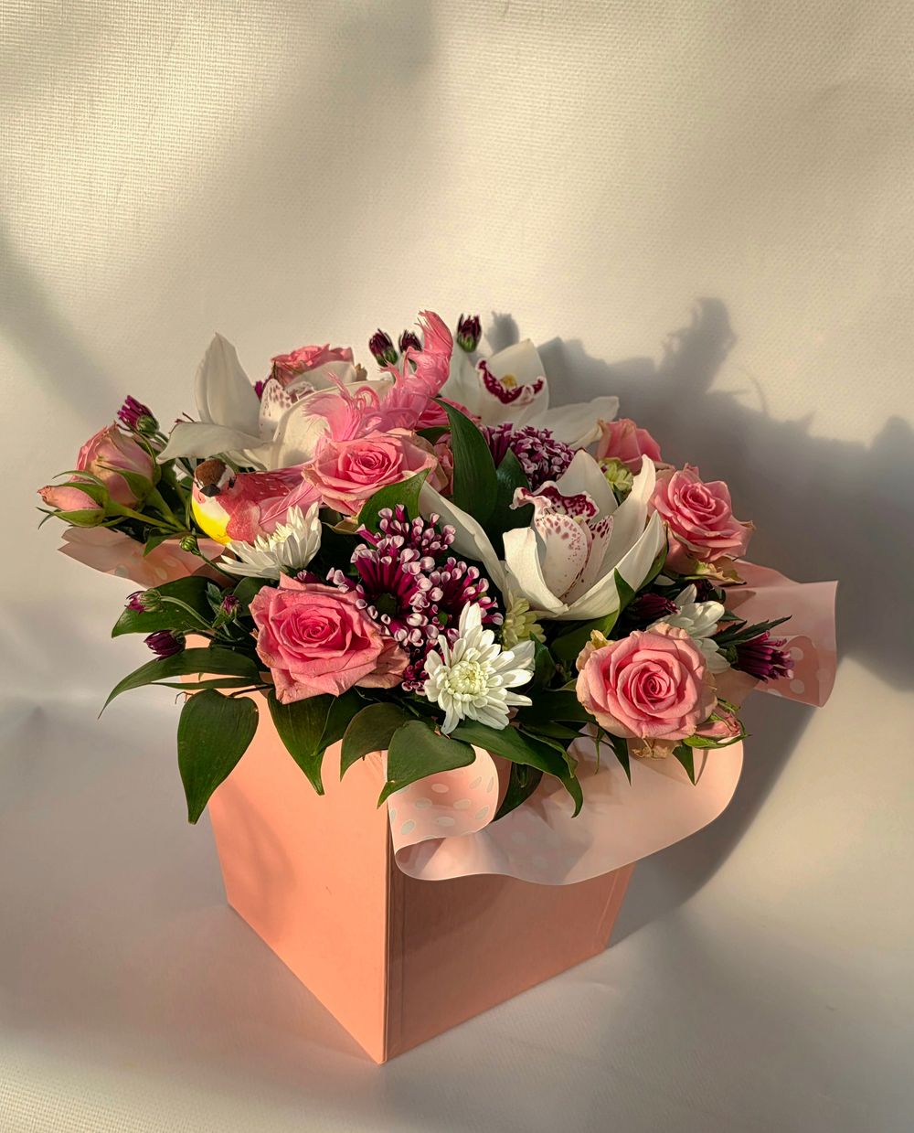 Композиция собрана в персиковой коробке, состоит из белой орхидеи, нежно розовых роз, белой и тёмно фиолетовой кустовой хризантемы.