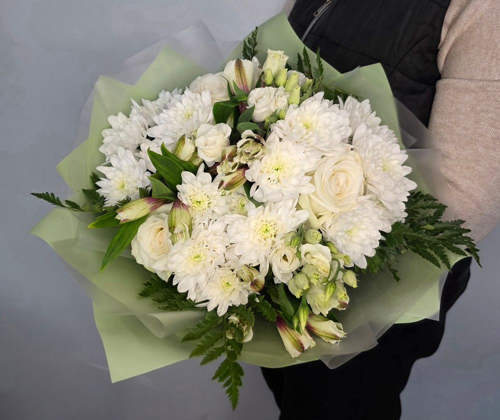 Букет состоит из белых роз, белой альстромерии, белой эустомы, белой кустовой хризантемы и папоротника. Оформлен в белую матовую и мятную флористическую упаковку.