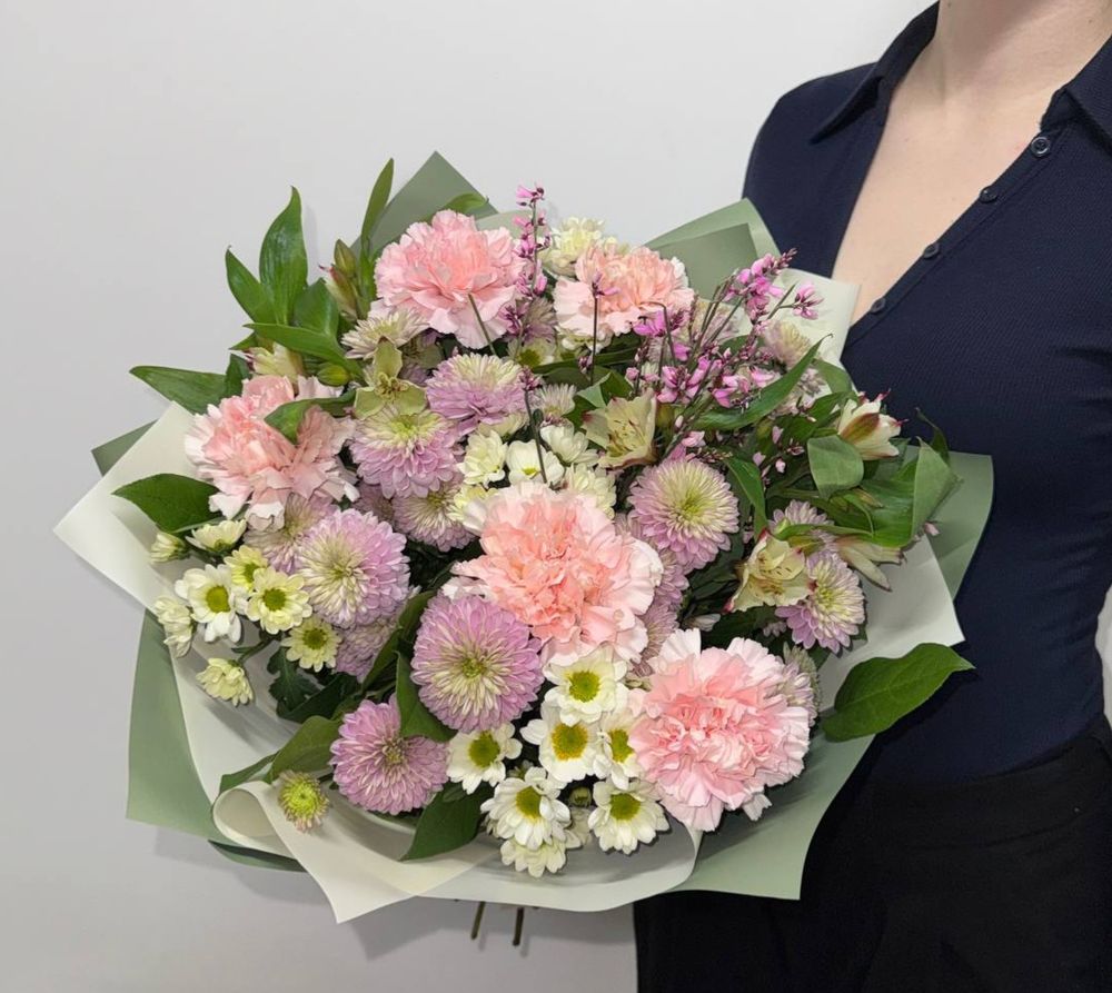 Букет состоит из розового диантуса, светлой сантини , фиолетовой кустовой хризантемы, белой альстромерии, розовой гентианой и рускуса. Оформлен в бело- оливковую флористическую упаковку.