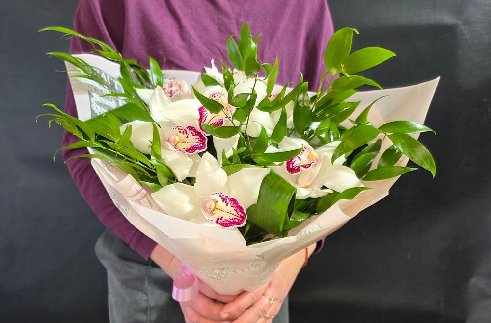 Букет состоит из белой орхидеи, аспидистры и рускуса. Оформлен в нtжно розовую упаковку.