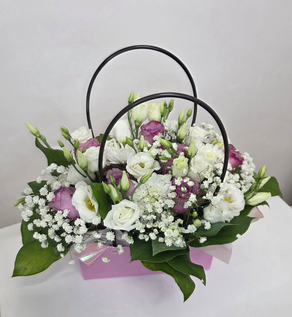 Композиция собрана из фиолетовой розы, белой хризантемы, белой эустомы, гипсофилы и салала. Собрана в нежно розовой коробке.