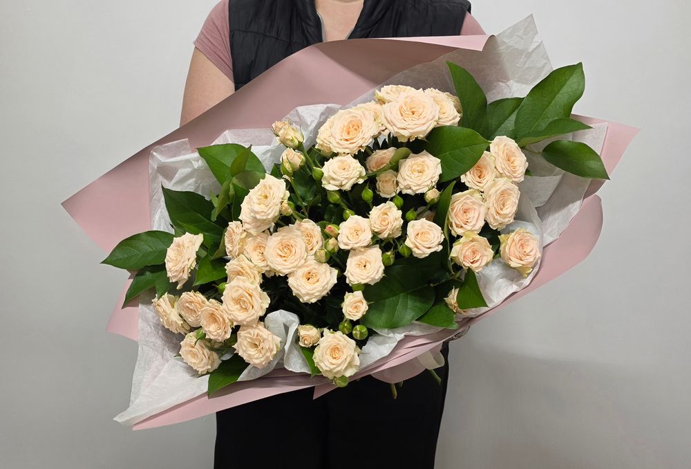 Букет из кремовых кустовых роз в шоколадной флористической упаковке с белой тишью.