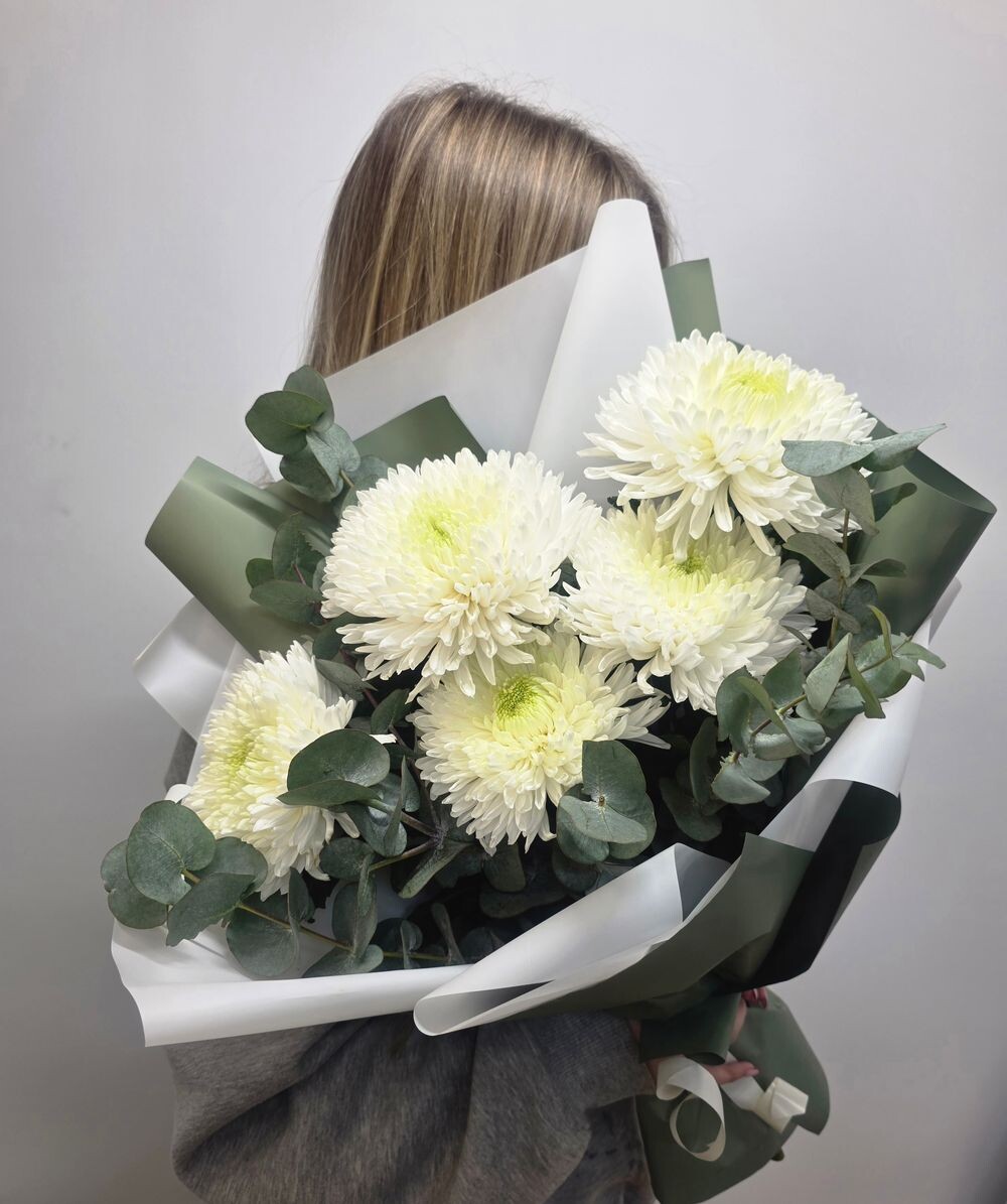 Букет собран из белой одногодовой хризантемы и эвкалипта. Упакован в белую и тёмно- зелёную упаковку.