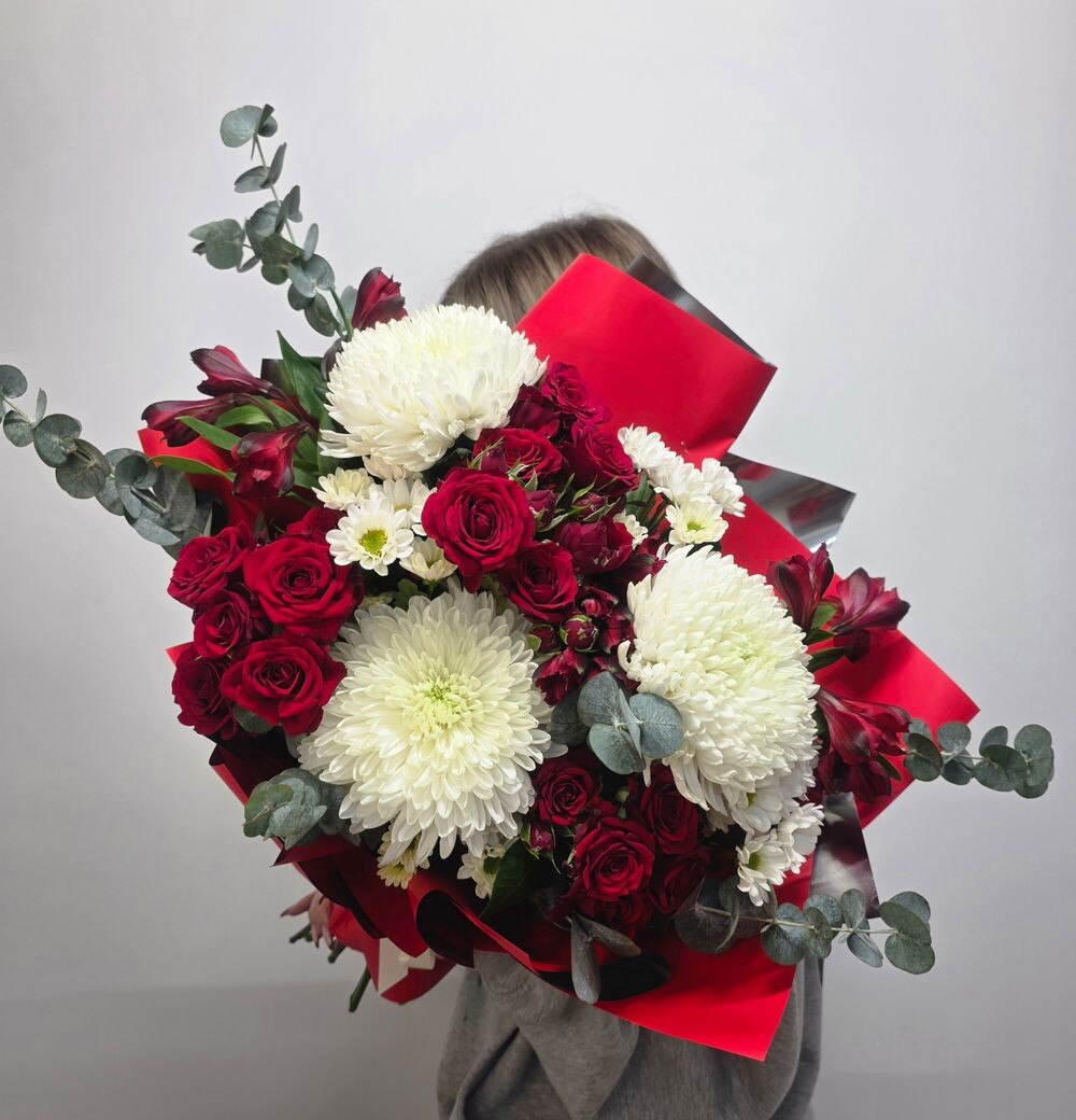 Букет собран из белой одноголовой хризантемы, красной кустовой розы, красной альстромерии, белой сантини и эвкалипта. Букет упакован в красную флористическую упаковку.