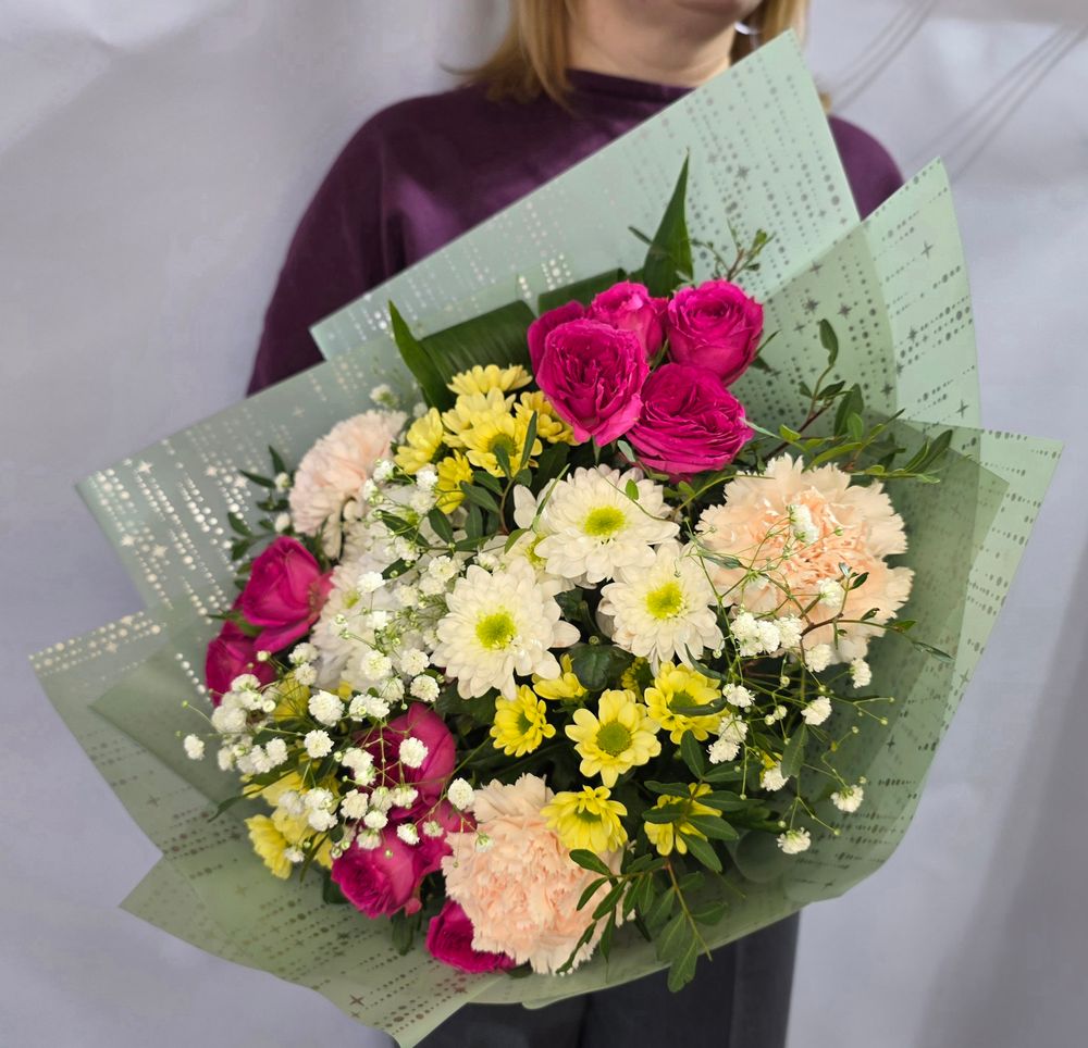 Букет собран из ярко малиновых кустовых роз, белой хризантемы, нежно кремового диантуса и зелени. Оформлен в светло зелёную флористическую упаковку.
